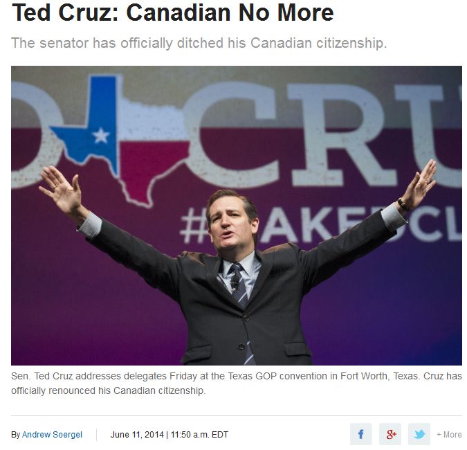 [U.S. News & World Report issued a story on 11 June 2014 of the renunciation of Senator Cruz’s Canadian citizenship]