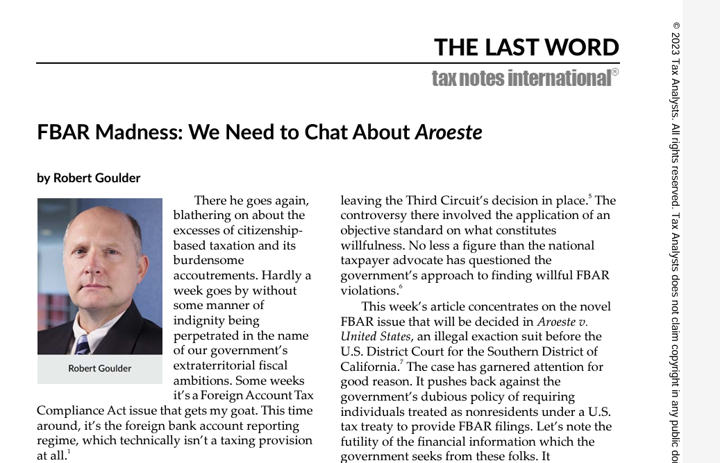 The implications of the Aroeste v United States – Order (Nov 2023) particularly for millions of taxpayers globally and “U.S.” taxpayers affected by pertinent tax treaty provisions, will be a focal point of discussion at the upcoming international tax conference in February.