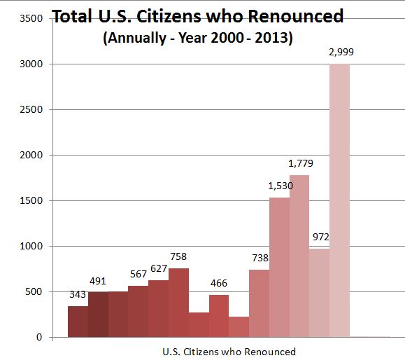 The statistics as to the absolute number and relative increases are astonishing. See, Wow, the number of 2,999 U.S. citizens who renounced in the year 2013 shattered the prior record set in 2011 of 1,782 renunciations. Why so many renunciations?